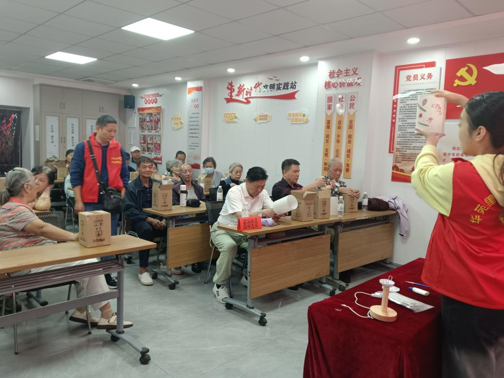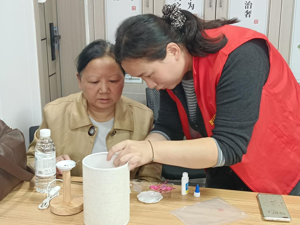 活动开始时,华苑里社区“好邻里”志愿者通过老照片介绍了传统中秋花灯的文化内涵,并讲解了将干花干草与现代台灯相结合的创意。现场制作的台灯兼具装饰性和实用性,既传承了中秋习俗,也体现了社区对居民日常关怀的用心。有党员表示,这样的设计让她想起了家乡的习俗,引发了大家的共鸣。